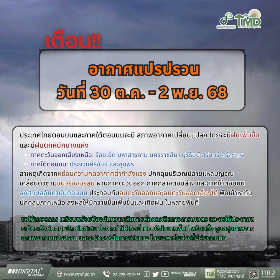 เตือน อากาศแปรปรวน วันที่ 30 ต.ค. - 2 พ.ย. 68 [30 ตุลาคม 2568]