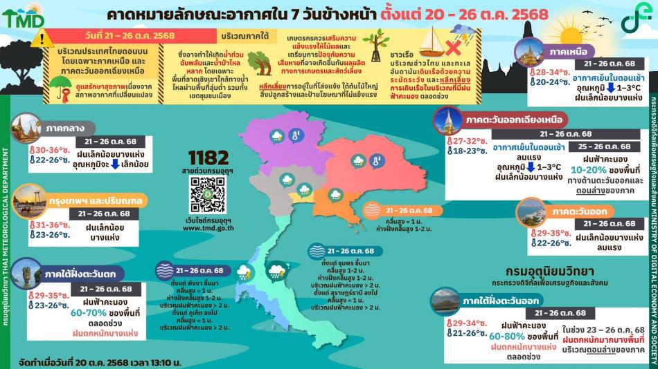 คาดหมายลักษณะอากาศใน 7 วันข้างหน้า ตั้งแต่ 20 - 26 ต.ค. 2568 [21 ตุลาคม 2568]