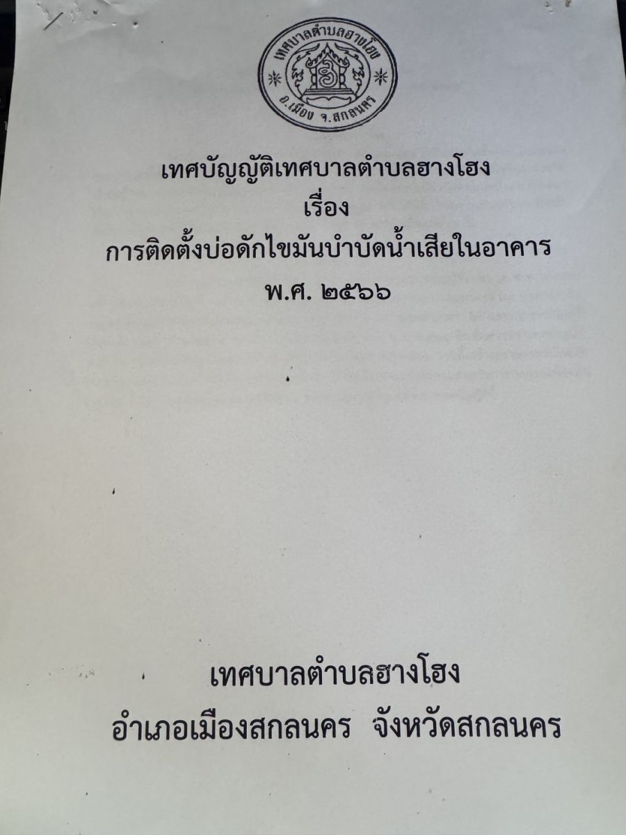 ประกาศใช้เทศบัญญัติเทศบาลตำบลฮางโฮง เรื่อง การติดตั้งบ่อดักไขมันบำบัดน้ำเสียในอาคาร พ.ศ. 2566
