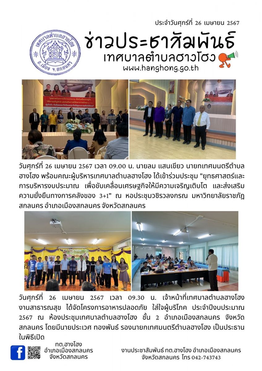 ข่าวประชาสัมพันธ์ เทศบาลตำบลฮางโฮง ประจำวันที่ 26 เมษายน 2567