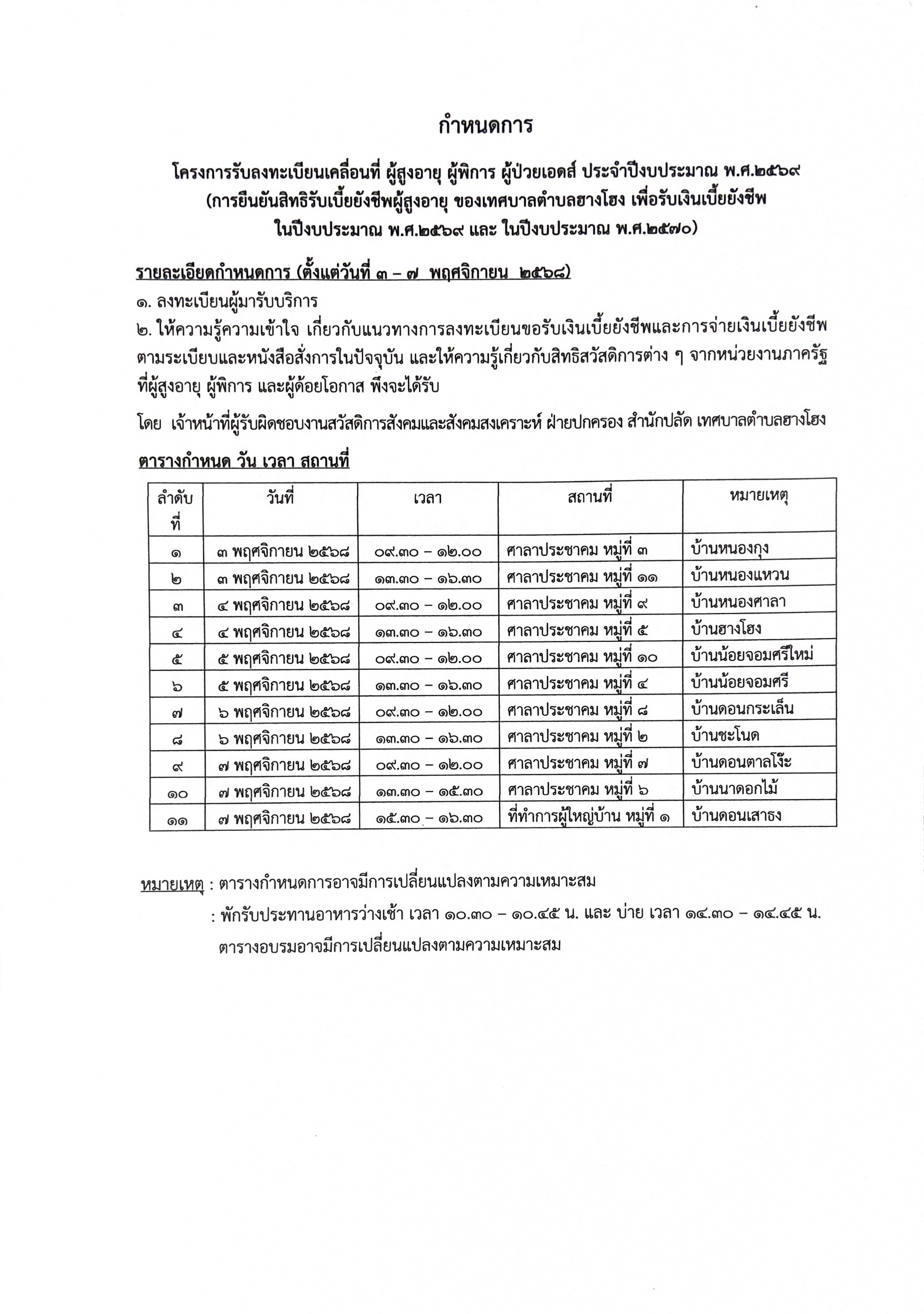 ชื่อเรื่อง : โครงการรับลงทะเบียนเคลื่อนที่ ผู้สูงอายุ ผู้พิการ ผู้ป่วยเอดส์ ประจำปีงบประมาณ พ.ศ. 2569 (การยืนยันสิทธิรับเบี้ยยังชีพผู้สูงอายุ ของเทศบาลตำบลฮางโฮง เพื่อรับเงินเบี้ยยังชีพ ในปีงบประมาณ พ.ศ. 2569 และ ในปีงบประมาณ พ.ศ. 2570) ในระหว่างวันที่ 3 - 7 พฤศจิกายน 2568